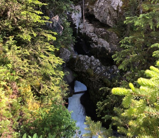 The waterfall came down through a rock arch, forming a unique spectacle. We rested at the rocky outcrop at the top of the waterfall. Pattra took off her shoes and put her feet in the icy, rushing water. We shared another of those petrified-amber spousal moments, and after about fifteen minutes, the couple with the wolf pup showed up again. Pattra and I donned our backpacks and moved on to allow them the same pleasure of solitude in this special place that we had just enjoyed. It was good timing.