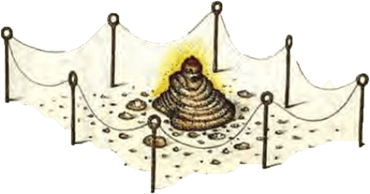 resting upon a bed of dust circled by sacred lines.
