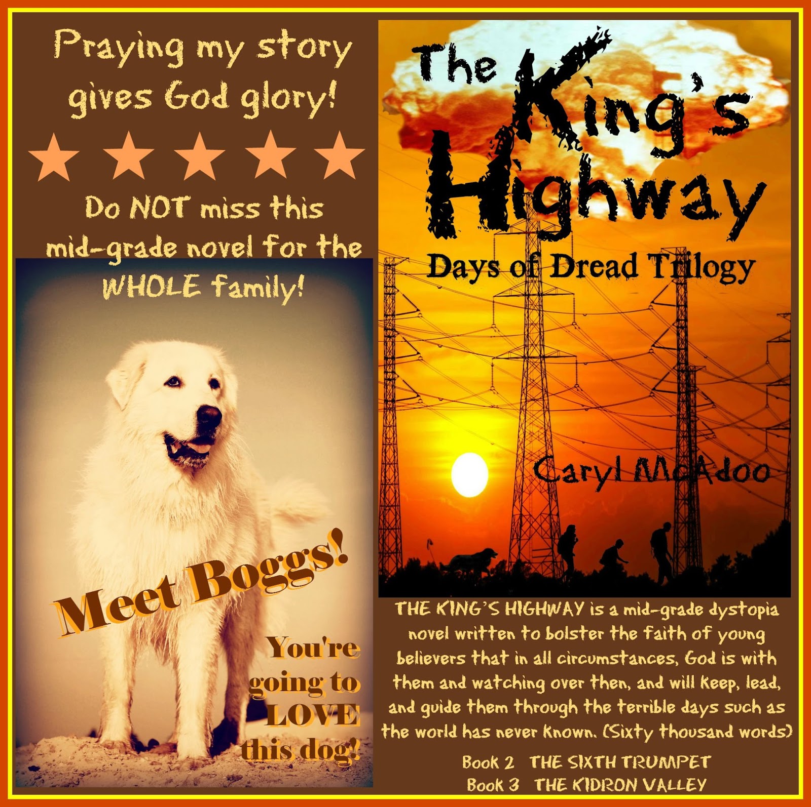 The King's Highway is book one of a new trilogy --Days of Dread--by Christian author Caryl McAdoo. Classified as a mid-grade dystopia, it's written to bolster the faith of young believers that in all circumstances, God is with them and watching over them and will keep, guide and provide for them through the terrible days such as the world has never known.