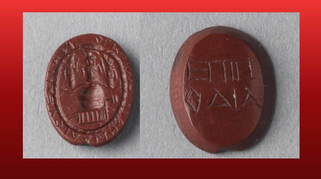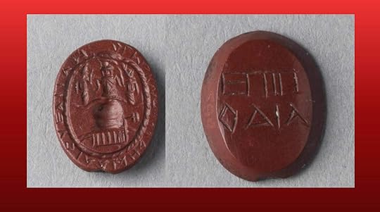 In this charm from The Campbell Bonner Magical Gem Database, Hekate’s twin torches are evident, below them are what appear to be bull’s horns sitting on top of a very full womb. The word inscribed on the back may be “Eilytheia,” or Divine Midwife, which makes sense given the illustration on the opposite site. The great ouroboros, the serpent of life, surrounds the illustration.