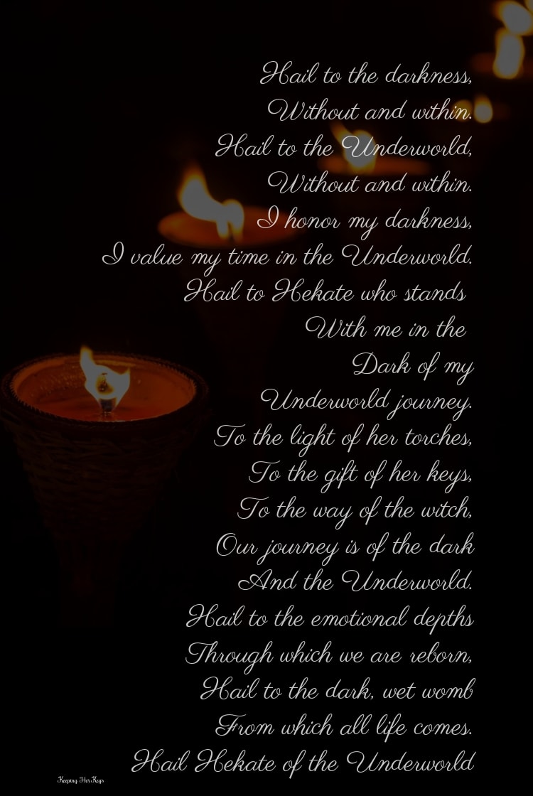 In the same way we leave offerings at a crossroads for Deipnon, during this ritual, we need leave our spiritual junk, the miasma, in Her underworld, and we don’t look back. We offer her the toxic parts of ourselves that we are ready to let go of, in order to make space for our rebirth, space to take up her keys and move forward as sovereign, fire-walking, truth-weaving witches.”