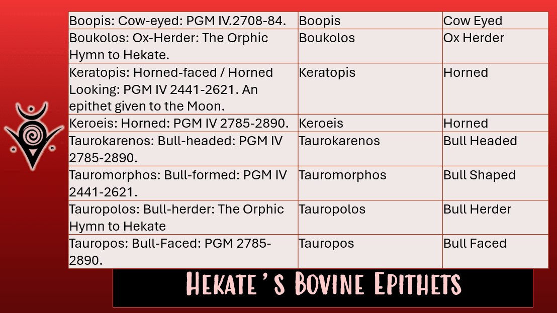 Not only is Hekate shown with bull horns in images from antiquity to today, ancient texts evoked her using titles linked to the bovine, from Tauroropolos in The Orphic Hymn to Hekate, to the more sweet-sounding “Boopis,” or cow-eyed in other sources.