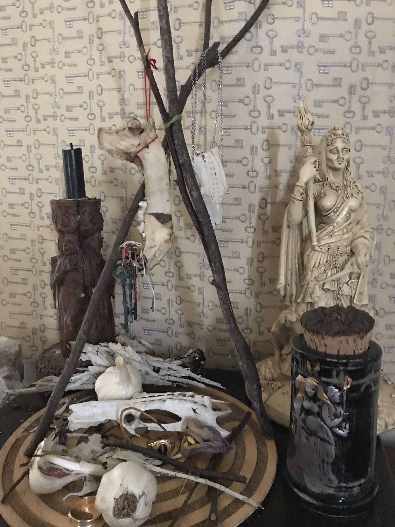 Creating a tripod by joining three special sticks, in this case branches of wild rose, is another way to evoke the energy of Hekate’s crossroads on an altar.
