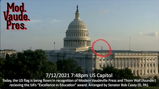 Last month, the International Jugglers’ Association announced that I was being awarded the Excellence in Education Award thanks to my efforts as a coach, as an organizer, and for my work with Modern Vaudeville Press. (Cue the fanfare – what an honor!) Press releases were sent out, the festival came and went, and the IJA’s plaque came in the mail and was hung on the wall moments later. Little did I know what else was coming my way… As it would turn out, BOTH the Democratic and Republican senators from Pennsylvania heard about this award and had plans of their own! On July 12th, Senator Bob Casey (D) had the flag raised over the US Capitol building to “…honor Thomas Wall – an academic and circus performer who works to preserve American performing arts history.” Two days later, on the 14th, Senator Patrick Toomey (R) also had the flag raised over the US Capitol building “…in recognition of Thomas Wall and his receipt of the International Jugglers’ Association Excellence in Education Award… a lifetime achievement which has been given out fewer than 30 times since the organization began in 1947.” Does juggling truly cross the aisle and generate bipartisan support? Is juggling the “great uniter”? (Or was there a simple paperwork mix-up?) In either event, the hallway leading to MVP’s office is now a patriotic stroll between a pair of flags–as tall as the corridor itself–flown over my nation’s capitol in recognition of the work I do. And that’s pretty cool. A massive thank-you to the International Jugglers’ Association, my artistic and academic collaborators, and everyone who’s suffered through long-winded answers to questions about juggling technique and history. You’ve made this juggler swell with pride and have encouraged him to stay the course.