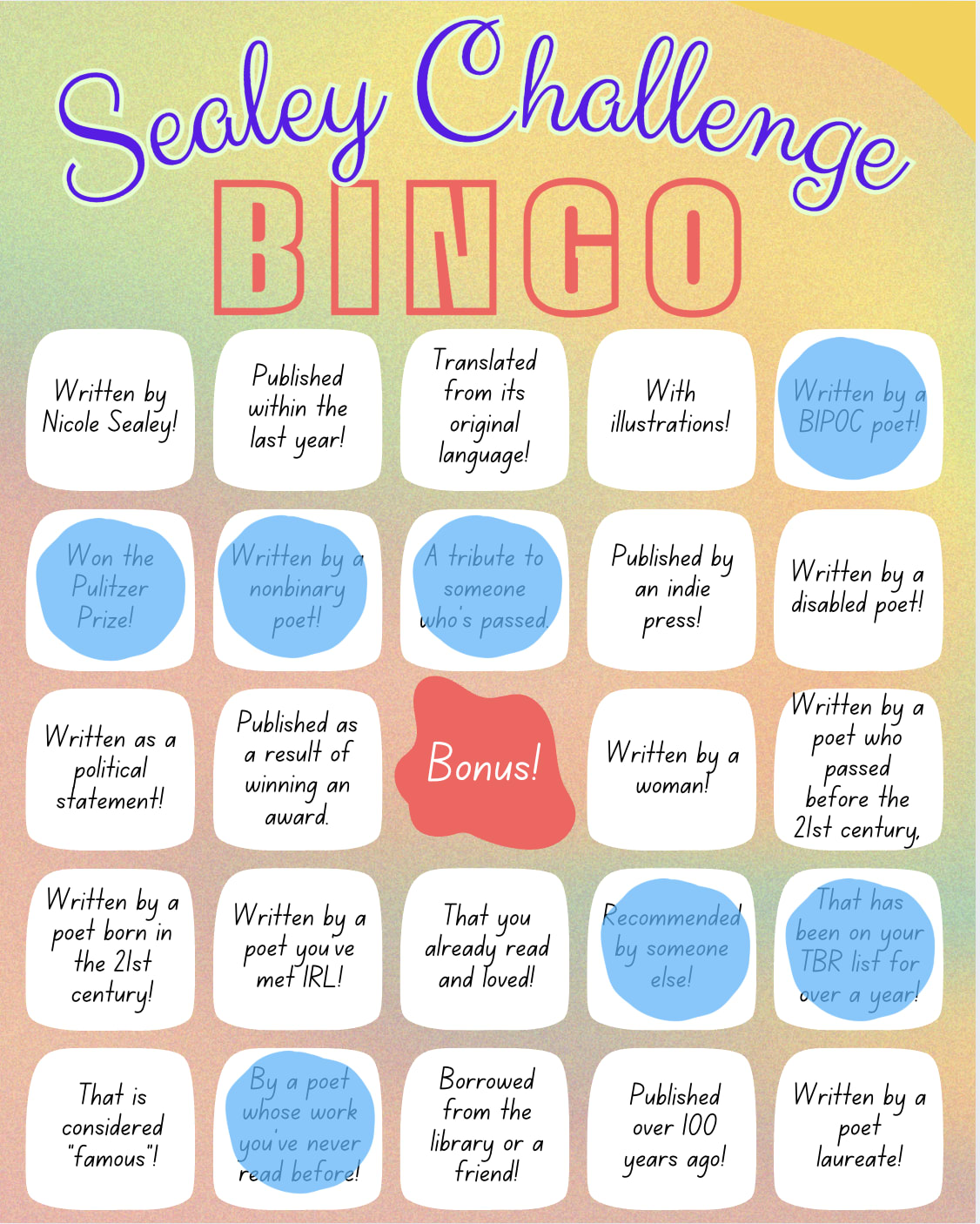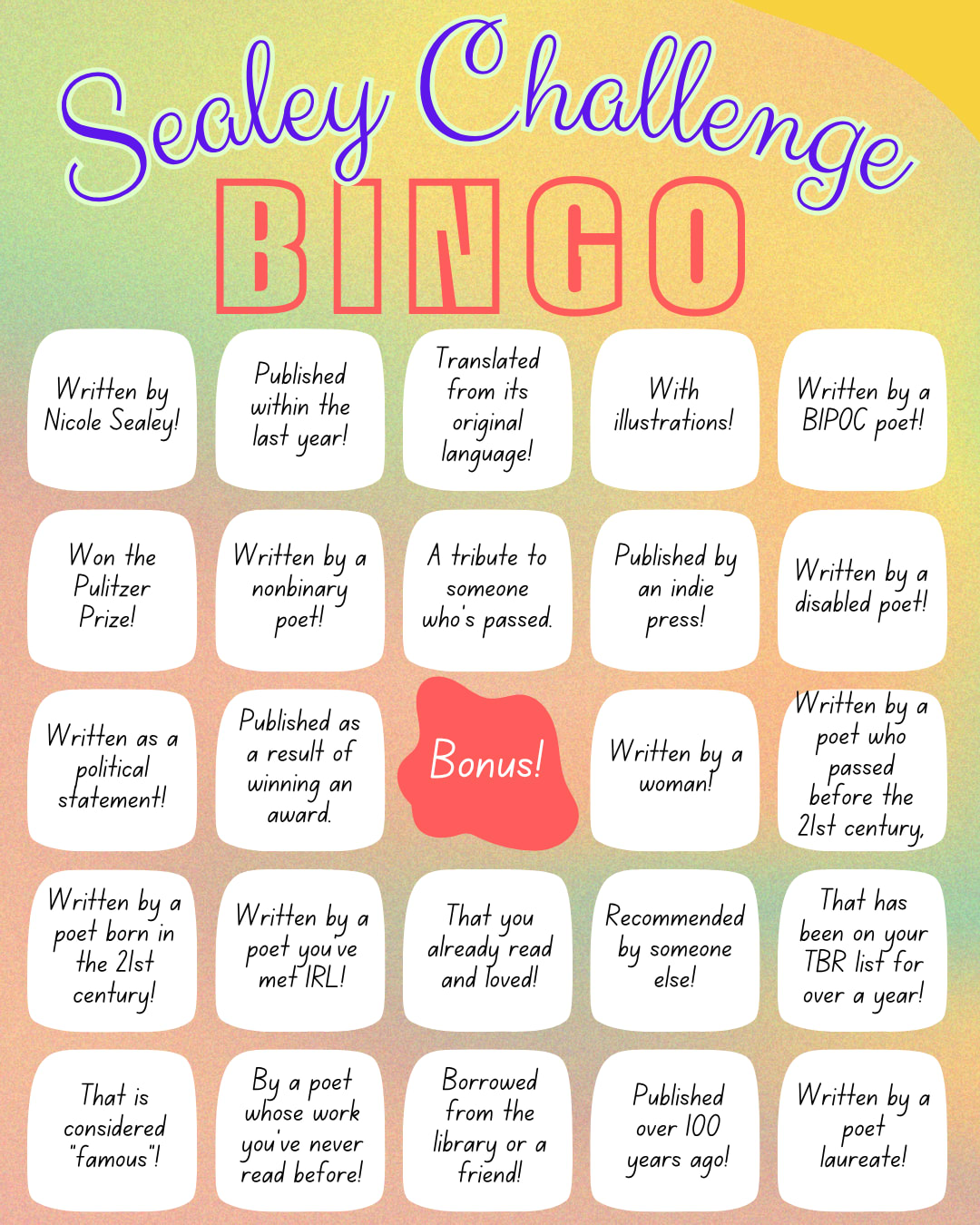 Today marks the beginning of the annual Sealey Challenge. Invented by poet Nicole Sealey, the challenge dares participants to read one poetry collection each day in the month of August. Try as I might, as of this writing, I have yet to complete this challenge. BUT! The beauty of challenges like this is even if I don’t complete the challenge 100%, I still reap the benefits of completing it 90% or 50% or even 10%. If I read one extra book that I wouldn’t have otherwise because of this challenge, that is still an overall positive.
