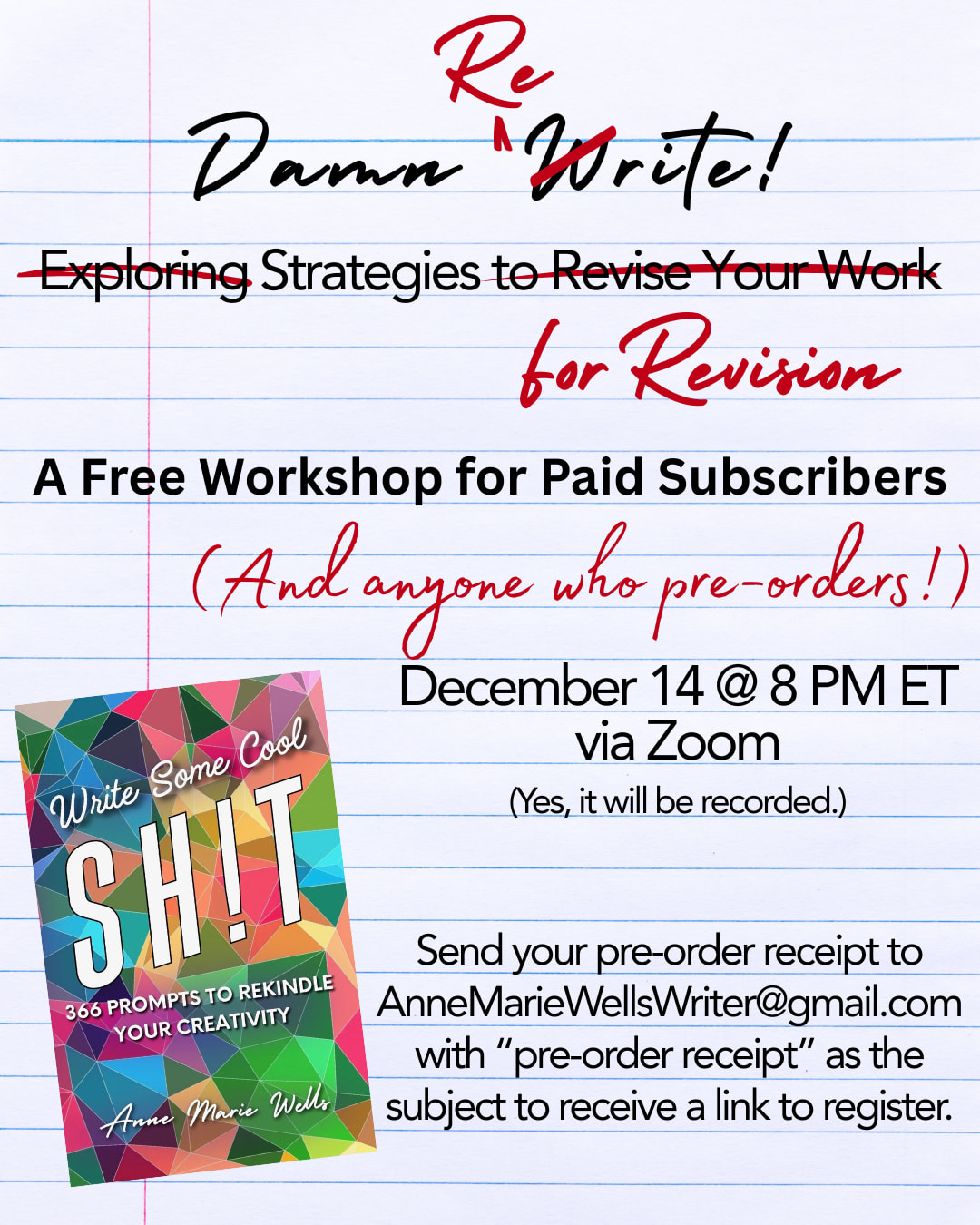 Anyone who pre-orders Write Some Cool Sh!t before November 29 will be invited to an exclusive writing workshop reserved for my paid Substack subscribers (You have to email me with your receipt). This FREE workshop on December 14 at 8 PM ET will focus on the art of REVISION.