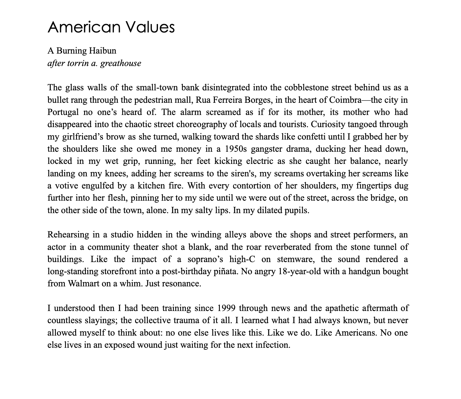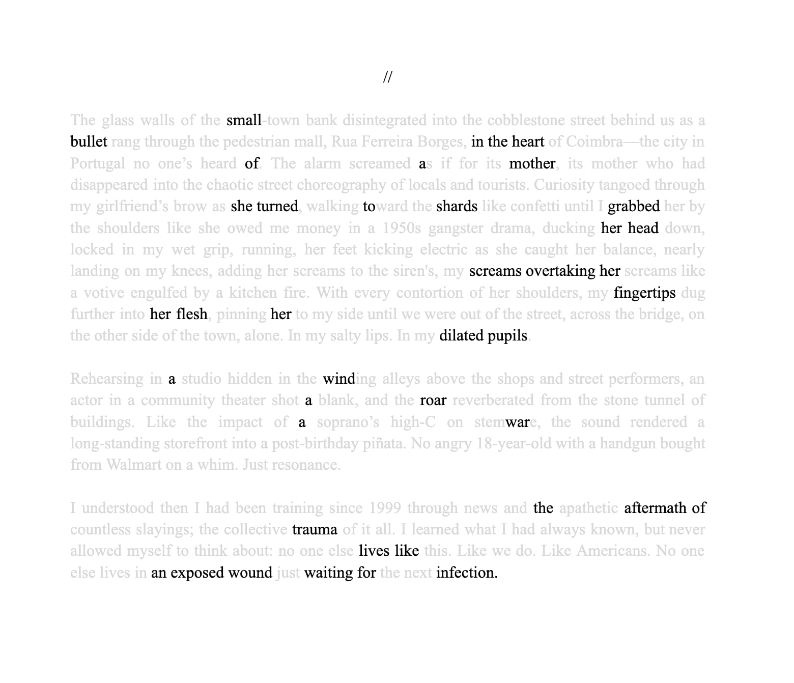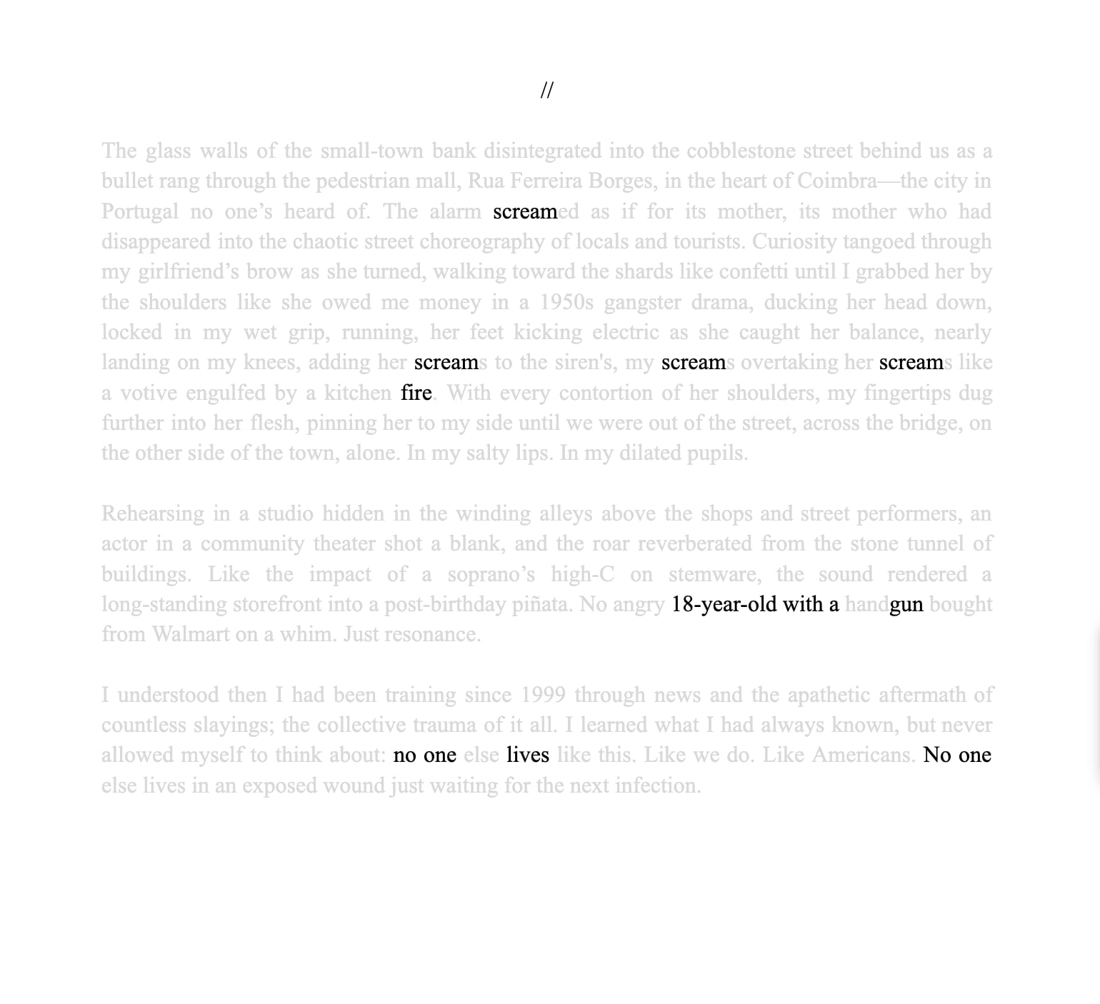 I wrote this poem many years ago about the collective trauma of gun violence in the United States. I've never been able to get it published anywhere, so I'm self-publishing it now.