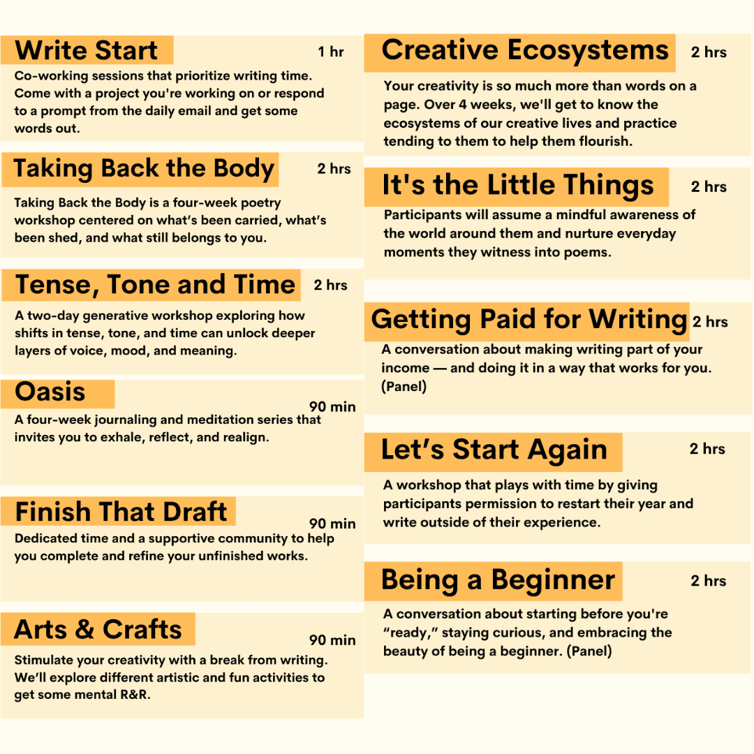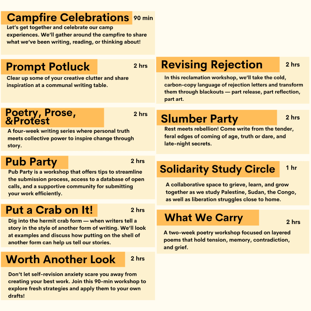 My good poetry friend (along with Priscilla Thomas and Nikki Gray) is leading Camp Write Start, a four-week virtual writing retreat with “97 scheduled events designed to help writers build momentum, find community, and show up to the page—without perfectionism. With live co-writing sessions, creative prompts, gentle accountability, and a welcoming vibe, Camp offers meaningful structure for writers of all backgrounds, genres, and experience levels… Camp Write Start invites poets, novelists, essayists, hybrid writers, and anyone (including those who don’t quite feel ready to call themselves a writer just yet) looking to return to or deepen their creative practice. Passes range from $45 to $300. Join for a day, a week, or the full month.”