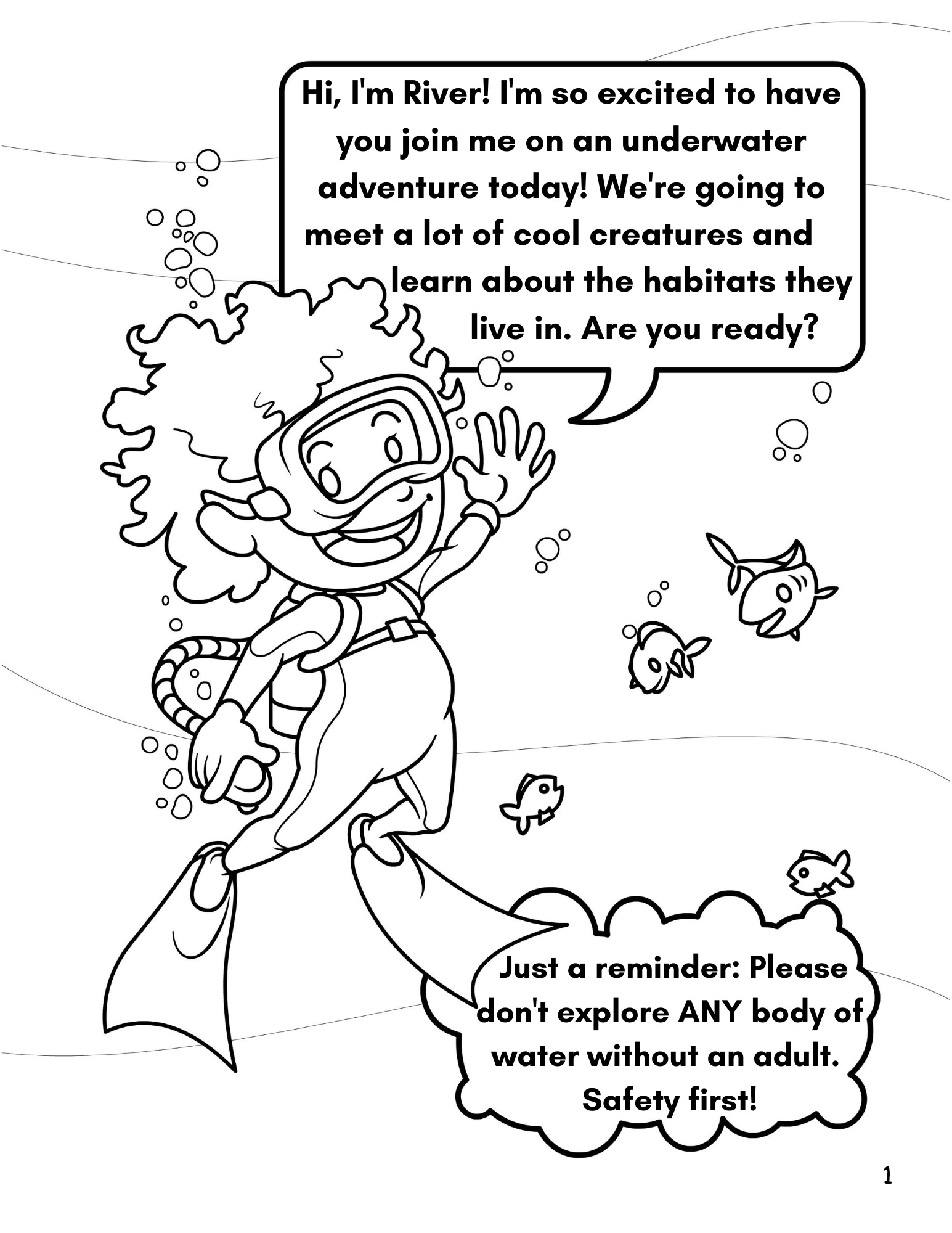 Being a storyteller, I came up with the idea of a preteen underwater guide, taking the reader along for an adventure, but also calling upon the reader for help occasionally along the way, like with building a warning sign via a connect-the-dots puzzle, creating a homey environment for shrimp through drawing, guiding a gray whale on its migration from the Arctic to Mexico in a maze puzzle, and more.