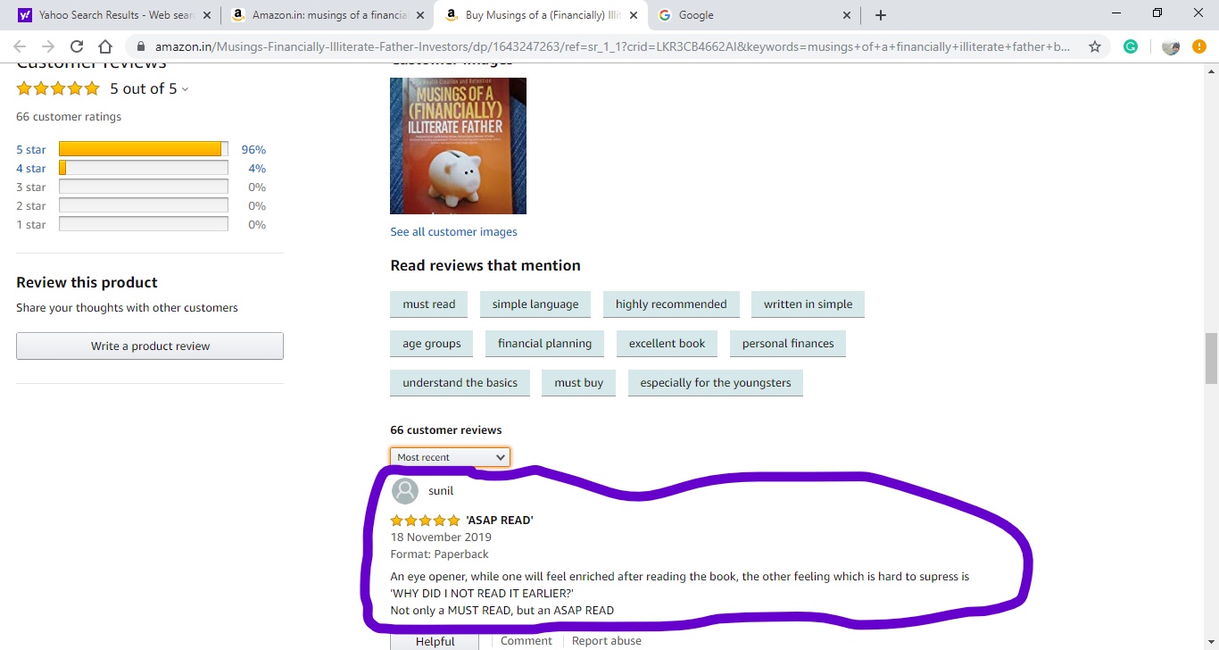 I would leave you to mull over these three financial lessons from Sensex journey and work out your methodology to invest in equity. Next week I will follow up this Sensex journey in detail while bringing out the investing lessons.One of the readers, Sunil, has this to say about “Musings of a Financially Illiterate Father” on Amazon, on 18 November- “An eye-opener. While one will feel enriched after reading the book, the other feeling which is hard to suppress is, “WHY DID I NOT READ IT EARLIER? Not only a MUST-READ, but an ASAP READ.” Thanks for your encouraging words, Sunil. A screenshot is below.
