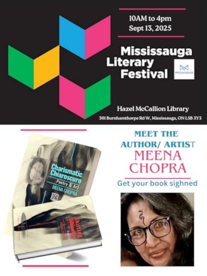 I am delighted to announce my return to the Mississauga Literary Festival this fall on Saturday, September 13, at the Hazel McCallion Central Library. I will be signing copies of my books, , Charismatic Chiaroscuro: Poetry & Art by Meena Chopra, a distinctive artistic journey featuring 44 poems, 80 original artworks, and 78 art video films, all accessible through QR codes for a fully immersive, multi-sensory experience. Attendees are warmly invited to stop by for a signing and an engaging, lighthearted conversation. I will be at the festival from 10:00 AM to 3:30 PM. Join me. Mississauga Library