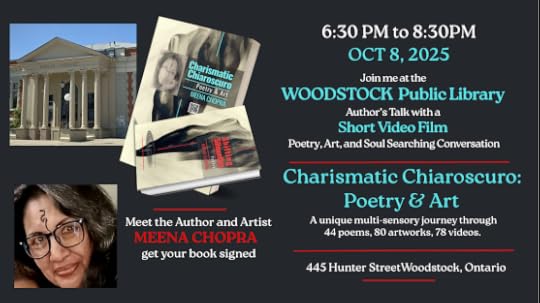 The Woodstock Public Library Ontario will come alive with words, colors, and moving images as poet, visual artist, and filmmaker Meena Chopra presents an Author’s Talk on her celebrated work, Charismatic Chiaroscuro: Poetry & Art.