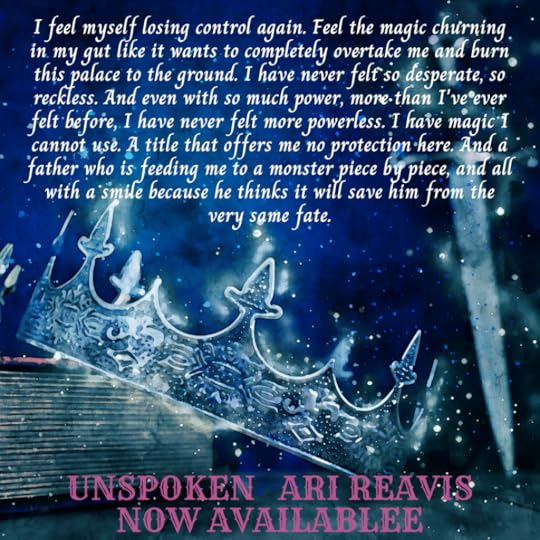 Just like all the other books about the histories of our kingdom, a name is blotted out again and again, black ink placed over whatever letters had once been there. It’s been the same thing for weeks as I’ve searched for any information about The Unspoken One. Blotted words, black ink telling me I shouldn’t be looking for him, but he’s my last hope now. With each day, my marriage to Azar draws nearer. My refusal to sign the marriage agreement has not at all deterred my father from continuing to promise Azar that our wedding will take place and end the tensions between our kingdoms. More and more I’m realizing that I have nowhere to turn. A father who cares so little for me, he’d hand me over to a, by all accounts, brutal killer. Advisors who have tried to intervene on my behalf, but can do very little to convince my father to call off trying to force the marriage. So now I look for the name of the only one I know is an enemy to my father, hoping he can save me somehow. It’s a foolish thing to hang my future on, I know, but it’s all I have right now.