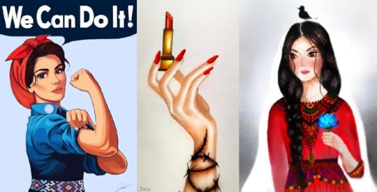 Above left, an Afghan version of a poster character created for Team Themis, Pakistan, based on “Rosie the Riveter” an allegorical cultural icon in the U.S. who represented women who worked in factories and shipyards during World War II, plus earlier artwork on the more feminine side.