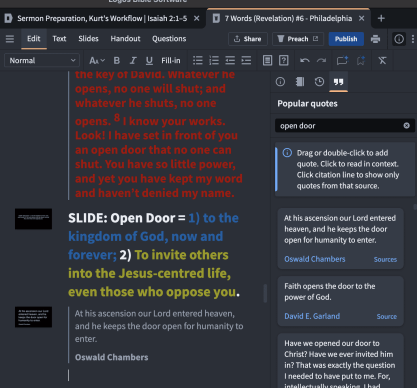 #2 Quotes for SermonsI’m not one to look for lots of quotes for sermons, but with this new feature I might be a tad more open to it. Basically, while working on a sermon you can click the “quotation marks” tab in the sermon info section. Then, type a key term and the database finds unique quotes that match up with your search term. I’ll show you a quick example of this here: