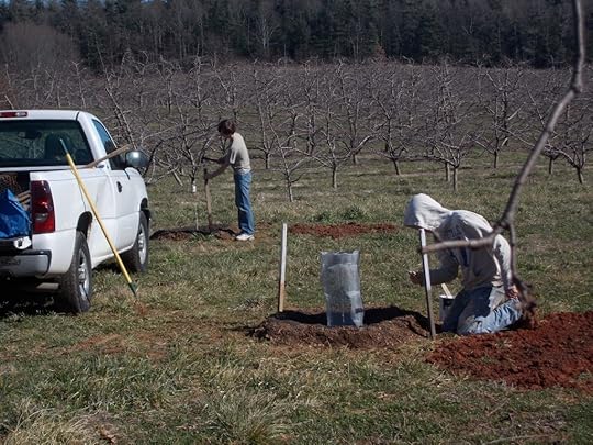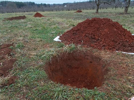 With the help of two sons, four holes appeared in a vacant patch on Orchard Road. Thick fescue skimmed off the surface went into a sod pile, followed by another spot strictly for precious topsoil, rocks and foreign objects picked out and pitched. Then the digging demanded more effort as sticky, wet, red clay constituted the majority of the matrix to be removed. This third heap would be the largest, with two feet being the required depth for the holes, destined to receive new apple trees, ordered and on the way.