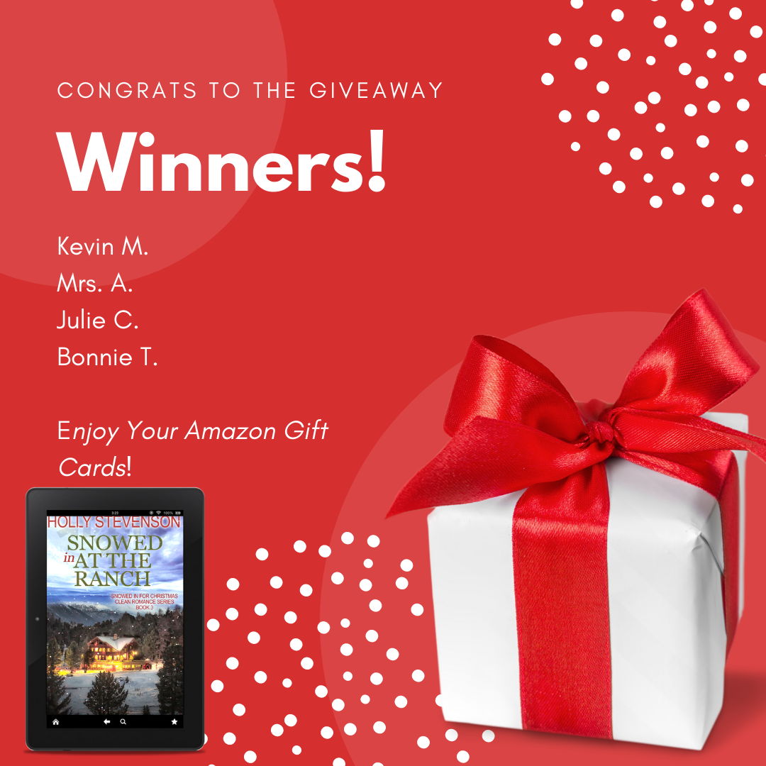 Congrats to the winners of the release party and giveaway for Snowed In a the Ranch! Enjoy the gift cards and happy spending!