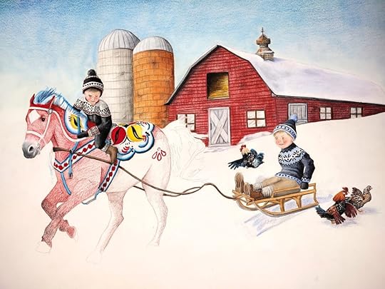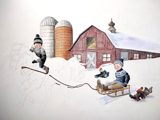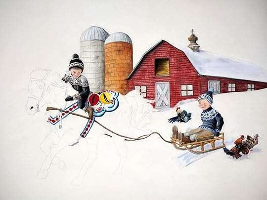 Once I decided to have a farm background for the intrepid sledders, I sketched in what I remembered of our old barn while I was growing up. The barn was around 100 years old; my great-grandpa built it after he moved here from Sweden in the late 1800’s, and it was the only barn until my dad built a bigger cow barn in the 70’s. As kids, we spent a lot of time in the old barn: the chickens were in possession main floor (and one of my chores was picking eggs every day), and the haymow was a frequent source of entertainment – it was a popular place for cats to have kittens, and we could build hay forts up there without getting in trouble. So I had a pretty good picture in my head of how the barn looked.