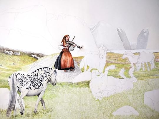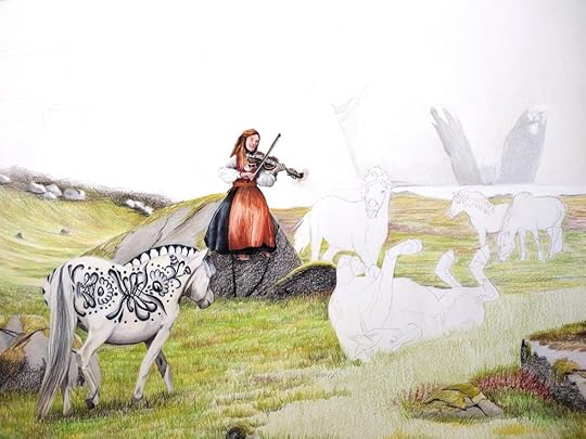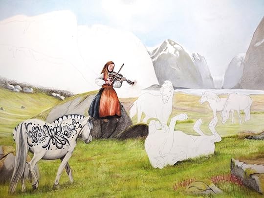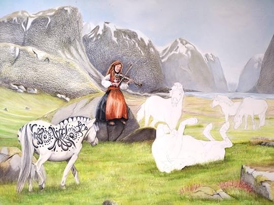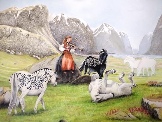 Dala horses have a very traditional style as a rule, but that’s not to say painters of Dala horses don’t have fun trying new things now and then. There are some beautiful Dala horses painted in only shades of black, white, and gray, with elegant kurbits (rosemaling) designs on the body. So with a more Norwegian-themed drawing–Norwegian Fjord horses, Hardanger fiddle, mountains, and a glimmer of an actual fjord–a more Norwegian design on the horses seemed appropriate!