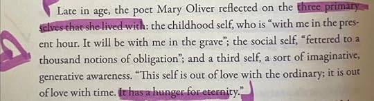 In this piece, Oliver writes about her three selves: the child, the social self, and a third self that is “out of love with the ordinary… out of love with time” and “has a hunger for eternity” (27). She implores that if we are not heeding to this vital self, all the while considering ourselves an artist, then we are imposters to our creativity (a poser of the creative realm, if you will). In doing so, we are neglecting our innate truth, as Oliver writes, “The most regretful people on earth are those who felt the call to creative work, who felt their own creative power restive and uprising, and gave to it neither power nor time” (30).