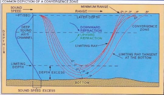 El TACTAS estaba optimizado para explotar las detecciones por zona de convergencia. La zona de convergencia es uno de los canales profundos que puede recorrer el sonido en la mar. Básicamente, consiste en que el sonido (que es vago y busca las zonas de menor velocidad, que es lo mismo que menor temperatura) se curva hacia abajo al salir de su emisor, hasta un punto en el que la «traza» (representación gráfica de la velocidad o temperatura respecto a la profundidad) se iguala a lo que teníamos cerca de la superficie y los rayos de sonido se empiezan a curvar hacia arriba. Como se ve en la imagen, suponiendo que el submarino sea el emisor (izquierda), esto hace que tengamos unos rayos que llegan a la superficie desde muy lejos, pero si el submarino se acerca, nos meteremos en una zona de sombra hasta que lo tengamos casi encima y lo podamos detectar por rayo directo (antes de que se curve hacia abajo).