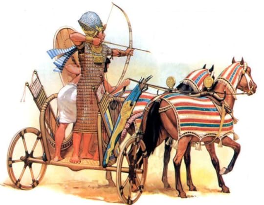 El carro de guerra egipcio es más ligero si cabe que el hitita: tirado por dos caballos, el vehículo consistía en una caja ligera apoyada en dos ruedas de radios (cuatro o más) que solo llevaba como dotación a un auriga y un arquero. Aunque pueda parecer un carro inferior a los que hemos tratado anteriormente, veremos que la combinación del carro ligero con el arco compuesto dará lugar al que posiblemente fue el carro de guerra más efectivo de la época.