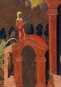 One day, seeing a crowd of Libyans and Egyptians moving towards the port, she followed them and set sail with them for Jerusalem, offering her body to pay her fare. When they arrived in the Holy City, she followed the crowd that was thronging towards the Church of the Resurrection, it being the day of the Exaltation of the Cross. She did this not from a desire to see the Cross, but to just follow the crowd and perhaps to seduce a few of them. However, when she reached the threshold of the church, an invisible force prevented her entering in spite of repeated efforts on her part. Whilst everyone else went in unhindered, Mary was left outside in the church porch, coming to the realization that it was her impure life preventing entry. She burst into tears and smote her breast and, seeing an icon of the Mother of God, made this prayer to her: