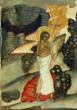 Leaving the church, she bought three loaves with the alms a pilgrim had given her, discovered which road led to the Jordan and arrived one evening at the Church of Saint John the Baptist. After having washed in the river, she received Communion in the Holy Mysteries, ate half of one of the loaves and went to sleep on the riverbank. The next morning, she crossed the river and lived from that time on in the desert, remaining there for forty-seven years without ever encountering either another human being or any animal.
