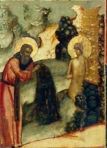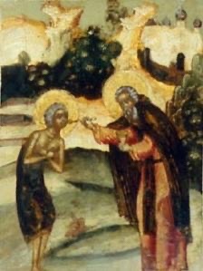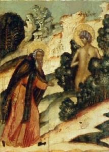 It was at this time that St Zosimas, a priest-monk was staying at a desert monastery near the Jordan. According to the tradition there, between the start of Great Lent the monks would leave the monastery and wander into the desert, spending the time until Palm Sunday in solitude and prayer. Alone in the desert it was ordained for Zosimas to see St Mary – naked and blackened by the sun, hair as white as snow. Seeking spiritual nourishment, Zosimas begged the apparition for a saving word or two, but Mary fled from him. When he came within ear-shot, Mary, calling Zosimas by name (even though they’d never met), asked him to throw her his cloak that she might cover her nakedness.