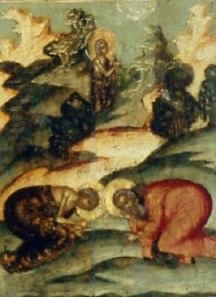 Perceiving the woman’s holiness, Zosimas bowed down before her asking for her blessing. Mary, likewise, bowed down before the priest-monk, and so for some time the two were prostrate before the other, uttering the words “Bless me…” After this, Mary asked that she may retire to a nearby hill to pray. At a distance, Zosimas could not make out the lady’s words, but after some time he saw her levitating above the ground. Because of this, he wondered in his heart whether this woman truly was a Saint, an angel, or a demonic delusion. When Mary had finished her prayer she returned to Zosimas and said: “Do thoughts about me, trouble you, Abba, telling you I am a spirit, and that my prayer is feigned? Know, holy father, that I am only a sinful woman, though I am guarded by Holy baptism. And I am no spirit but earth and ashes, and flesh alone.” And with these words she guarded herself with the sign of the Cross on her forehead, eyes, mouth and breast, saying: “May God defend us from the evil one and from his designs, for fierce is his struggle against us.”