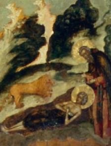 After having vainly tried to break up the earth with a stick, he suddenly saw a lion approaching Mary’s body and licking her feet. On the orders of the Elder, the beast dug a hole with its claws, in which Zosimas devoutly placed the Saint’s body.