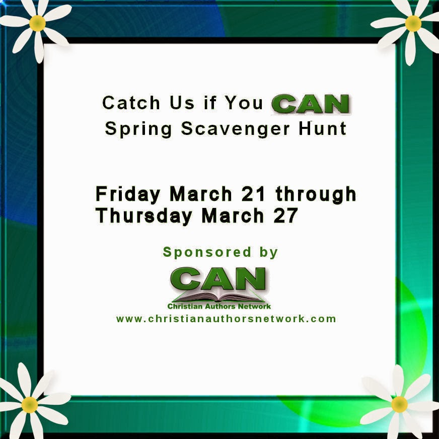 WELCOME, to the Catch Us if You CAN: Spring Scavenger Hunt! We hope you enjoy meeting Christian Author Network members as you chase clues for the chance to win our grand prize: $200 in gift cards from CBD, Barnes & Noble, or Amazon, plus 29 free books, one from each participating CANauthor! · 2nd & 3rd Prizes: $50 Amazon, B&N, or CBD gift certificate! · This hunt begins at Noon on Friday,03/21/14 and ends at Midnight on Thursday, 03/27/14. No hurry as you search for clues—you have almost an entire week! If you need help during the hunt, check in here: http://illuminatingthewordthroughfict... · Enjoy 29 stops, each featuring a different CANauthor!· Gather clues from each post, beginning at STOP # 1 and ending at Stop #29. Follow the directions and fill out the Rafflecopterform. Be ready to provide the complete clue in sentence form, gathered from all 30 stops, within 2 days of email notification or another winner will be randomly drawn. There is no need to email/submit the clue, unless you are notified by 03/29/13.Sorry, due to international regulations and postage costs, prizes will be awarded to US Residents only. Individual contests within the hunt may vary, so please read rules presented with each giveaway.
