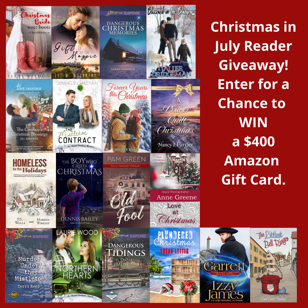 Happy Christmas in July! Welcome to the first blog in the 2022 Christmas in July Reader Blog Tour & Giveaway, which runs July 15-22, 2022 (contest closes at 8 p.m. Eastern on 7/22). At the bottom of each author’s blog post, you will find the name of a Christmas song. Write them all down and provide all song titles (26 in total) on this Google form. See below for a list with links of all participating authors!