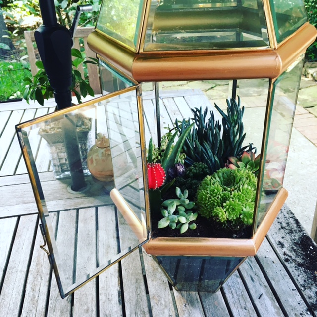 What are some of the things you like to do for fun?Oil painting is really relaxing for me. Also painting with acrylics. I really lose myself in the creation. Writing makes you think, but painting is different. You go with the muse of the moment. I like it. However, since we got a Jack Russell Terrier puppy, the word, "relax" isn't part of my daily life much any more. Gypsy is going on ten months now and a bundle of energy and mischief. I haven't been able to paint much. I have enjoyed a bit of crafting though. My oldest daughter Katie and her husband Dan asked me what I wanted for my birthday and I asked them to finish a project for me. Turned out to be the best gift ever! A friend down the street replaced one of her large brass and glass lanterns with a chandelier, so I asked her for the lantern. I decided to make a terrarium out of it and fill it with succulents. They did it for me! And I was overjoyed. Check out the photo of it!
