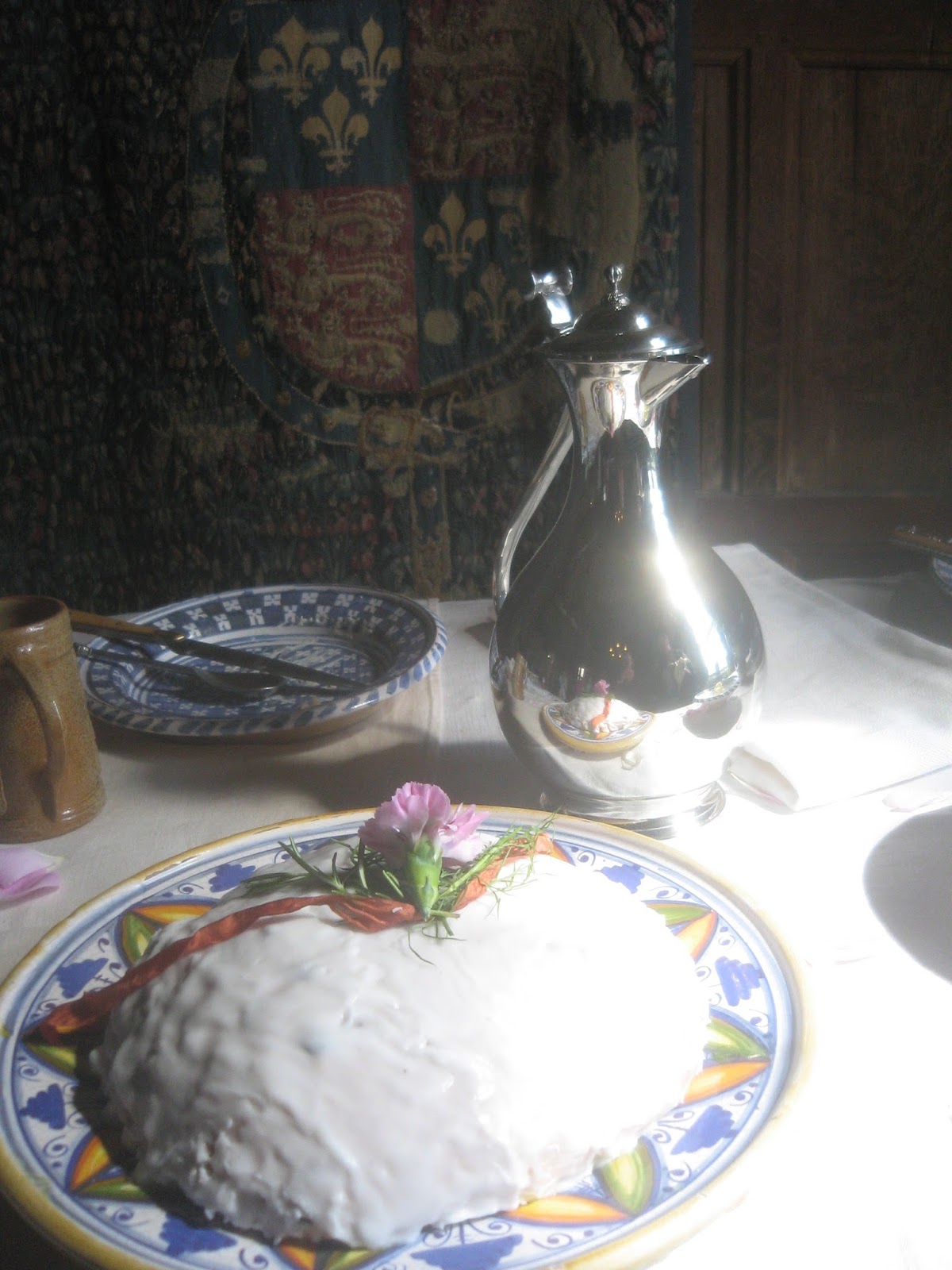 Servants bring the first dishes. Double linen and the best majolica for the top table! The 'Bride Cake'. Children weren't allowed to sit until they showed enough maturity to do so!