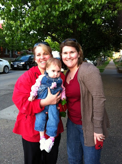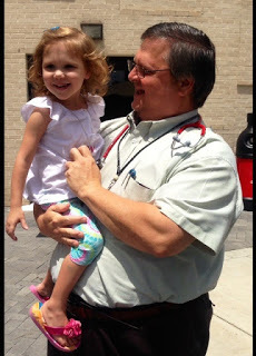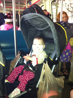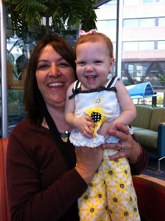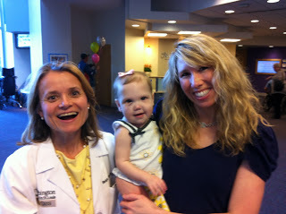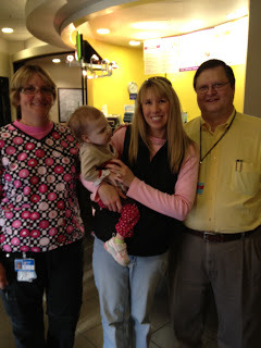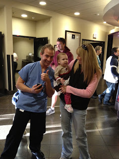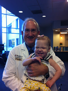 While we waited for Wrenn we saw so many people who had worked with our family. In a way I couldn't have planned a better goodbye to St. Louis. We ran into her surgeon, Dr Huddleston, who is leaving Children's and going to a nearby hospital. I already told our transplant team that should Wrenn need additional surgeries we'd be following him, especially since he's done so many procedures on her and knows her best. He is an excellent surgeon and we feel her care would best be furthered with his expertise. Dr. Huddleston saw Wrenn for the first time since the transplant Christmas party. He peeked into the stroller and she looked up at him and started to cry. I felt so bad but I smiled and said, "ahh, isn't that sweet, Dr. Huddleston, she wants you to hear how great her lungs work." Of course he smiled.