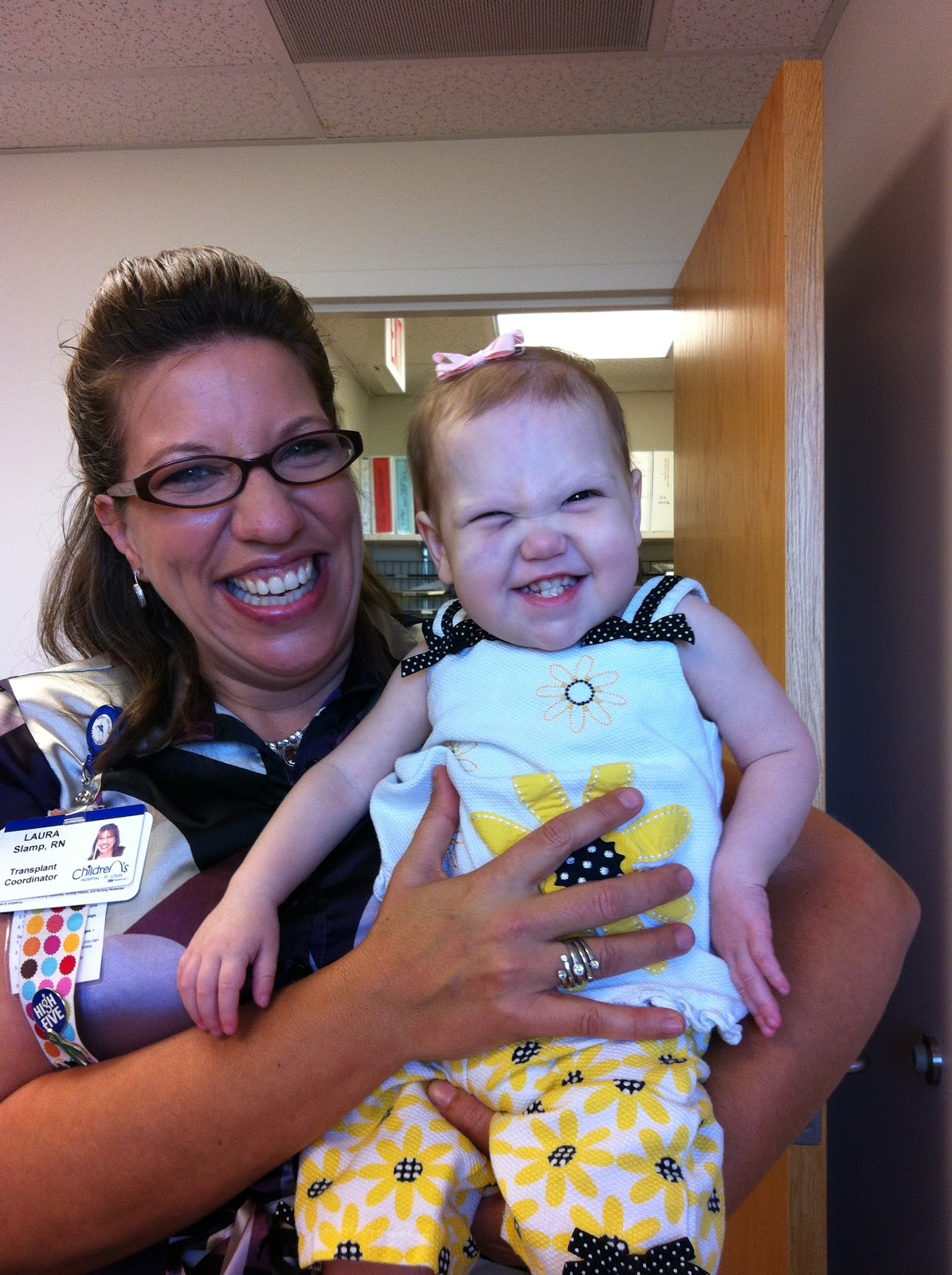 Next we visited Laura and Donna from the transplant team. Our transplant coordinators are the nucleus of Wrenn’s survival team and keep us on track with all her labs, results, shots, appointments, general health concerns and inform Wrenn’s new Virginia doctors. Wrenn was the first double lung transplant recipient to come to St. Louis and NOT leave within those first three months. So the team really had a chance to watch her steadily heal and developmentally grow. Back in July, Dr. Michaelson had said that they weren’t yet ready to cut the umbilical cord and neither were we. Sometimes life gives you a push and you know it’s time to move forward. We all feel as far as Wrenn’s health goes that we are leaving at the perfect time and on the best note: Perfect.