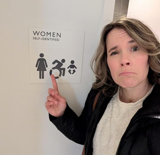 Upon discussing this with my husband, he mentioned the “Self-Identified Men” sign outside the restroom he used, along with a selection of complimentary feminine hygiene products. Seeing this sign gave me pause. Self-Identified Woman: Is that what I am?