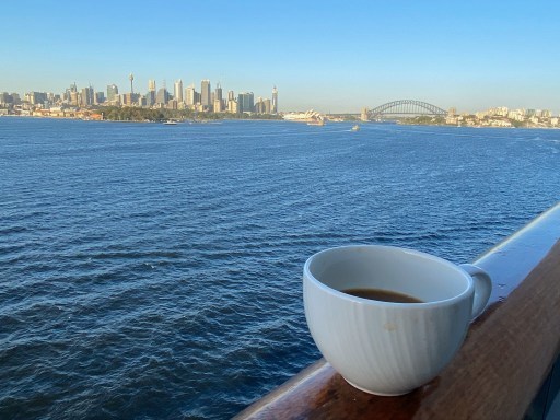 Breakfast on our Balcony We awaken around 515am Wednesday 19th February just as we pass through Sydney Heads – perfect timing. It’s dark but the shadowy heads are just visible although looking smaller than expected, no doubt because our cabin is located on the equivalent of the eighth floor of a...