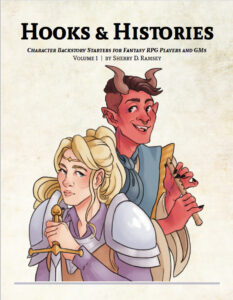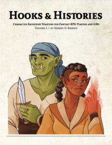 Several years ago, I released an RPG gaming supplement called Hooks & Histories, offering backstory starters for player characters, NPCs, or even fictional characters. Along with a customizable backstory, each character type comes with a “Qualities & Quirks” section that can add another layer to the character and may be incorporated into gameplay if the player and GM wish. It’s been fairly popular, so I’m pleased to announce that I’ve re-released it with new cover art, and also released a Volume 2 with even more backstories to choose from.