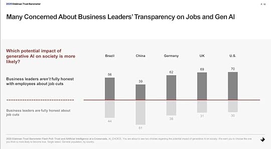 Today, all over the world is there is deep concern among people in many organizations that AI is a threat to their livelihoods. Richard Edelman earlier this week at a dinner that Terence Kawaja invited us to after the announcement of the AI Lumascape (take a look it has created quite a stir) handed me the latest Edelman’s Trust Barometer flash poll which is worth reading. Here is the link to the report and one of the slides is reprinted above.