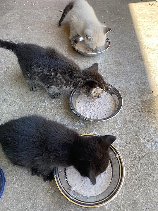 Everyone is doing great, amazingly. Our inside boy is named Toulouse. The three orphan kittens are named Marie (a white fluff ball), Berlioz, (a solid black kitten) and O'Malley, (a tiger-striped boy). They all have the bluest eyes, and they meow/squeak and run/waddle to me, and I kind of love it.)