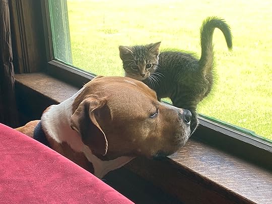 Our dogs, we have an American Bull-Dog (Mister) and a Pittie Princess (Violet), ,have taken to making sure the kittens stay clean with lots of licks, and though the indoor cat, Toulouse, has declared himself dominant, we know who's the boss. Mister has been on the receiving end of tail-attacks as Toulouse grows bigger and cattier, (pun absolutely intended) and Violet is simply putting up with the kitten's mock-attacks until he learns to find a different playmate, too. I have the best dogs in the world.