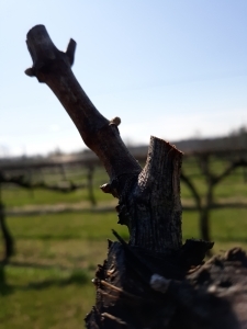 So, we prune the grapevine canes back to just a few buds every winter. Now the buds that break in spring are right by the trunk and arms in a range where it is easier to concentrate our sprays, energy, and labor to tend them.