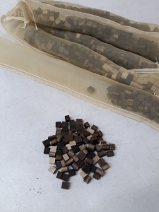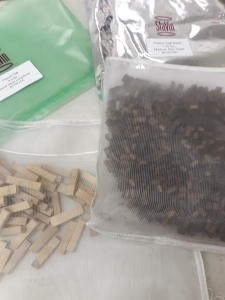 These are bags of “oak dice” being prepared to use in our horizontal steel barrels. they include stave as well as end cap wood.