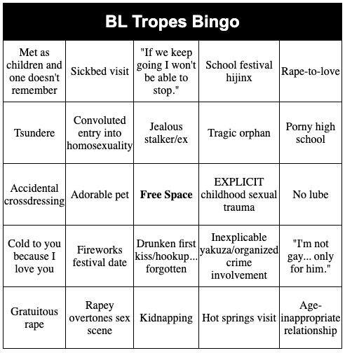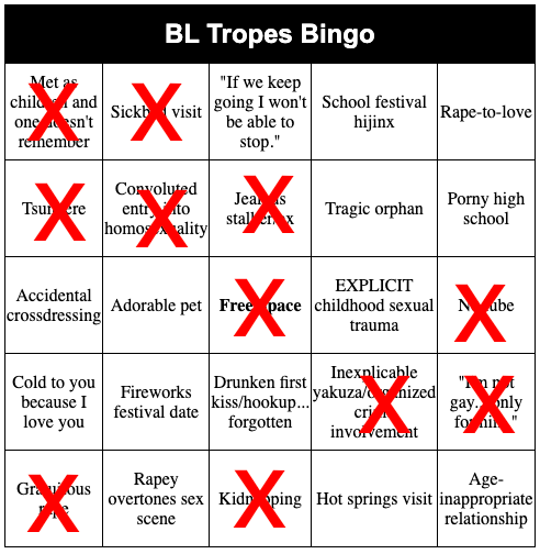 Level of Problematic: Yoshiki’s troubled digestive system; I mean, it’s an eldritch gay horror where the love interest is already dead. The hint is in the title. So you know what you’re in store for. Sad, sad gays.