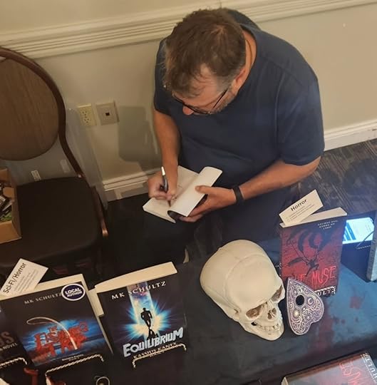 ...Enter MK Schultz - As the only author representing the horror and sci-fi genres, I had been pondering for quite some time about how this event would go. Would everyone avoid the table with the life-sized human skull and alien on display? Would I miss out on sharing my writing, making the 1 hr 45 min drive and 5 hour event a disappointment?