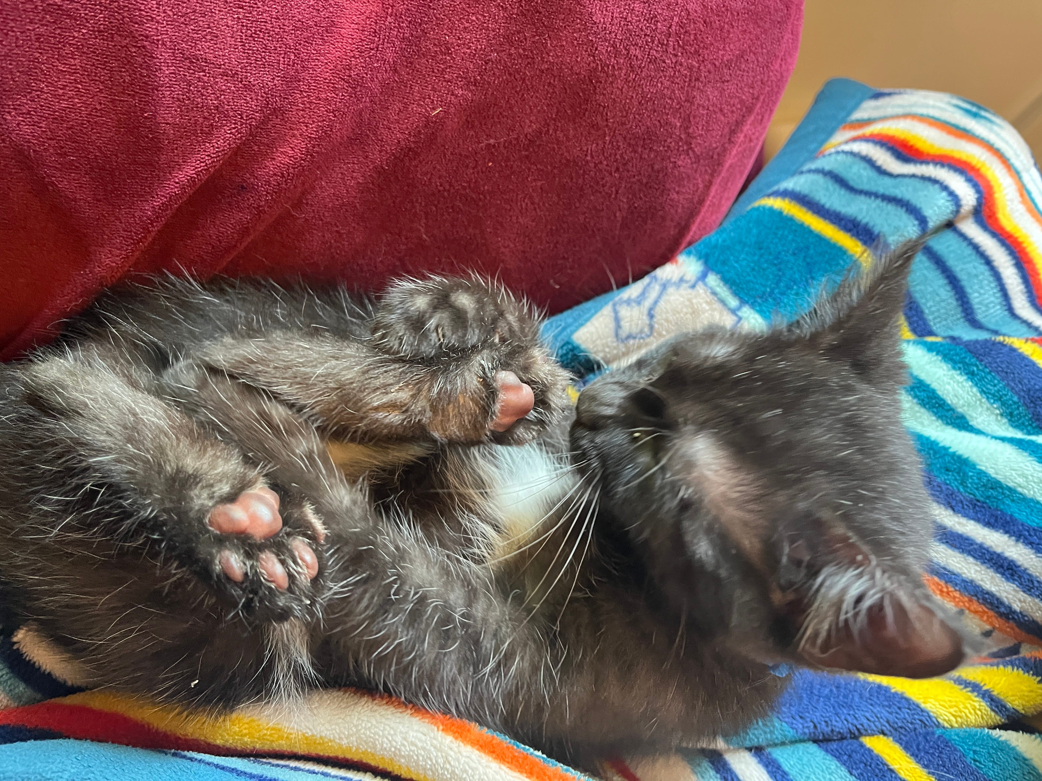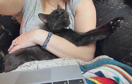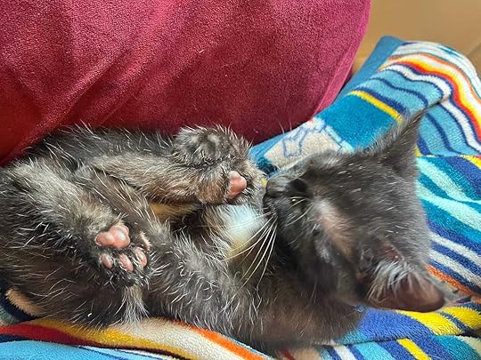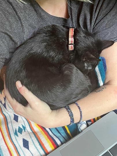 No one in my immediate family has ever owned cats; my husband was surprised to realize they didn’t say “purr” rather than actually purring. We definitely didn’t expect a house of die-hard dog people to change into cat people overnight. Navy and Babou like to sit in my lap while I write; Navy demands that my fourteen-year-old wrap him in a blanket and tote him around like a baby. They’re absolutely delightful, whether they’re in demon mode or sleeping mode (generally, their two state of existence).
