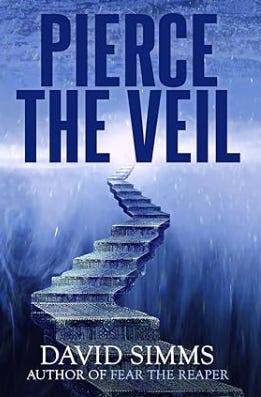 Just finished David Simms’s Pierce the Veil, a tense psychological horror/thriller that examines what happens after we die (Macabre Ink, July 2024). Simms did a tremendous amount of research on NDEs (near-death experiences) for this novel, and it shows. The book follows Boone, a high school music teacher who dies after plunging into an icy river. A full day later, he’s resurrected with little to no memory of his death.
