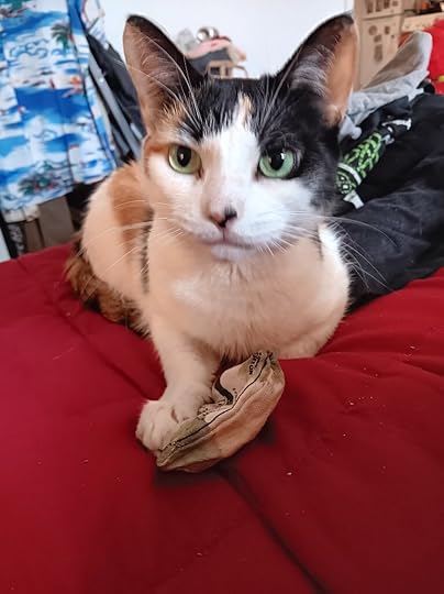 This is Cousin Skye, who is a dog, and different from Big Sister Skye, who is a cat (Rainbow Bridge) and her lobster toy from all of us. That is the only picture of said lobster toy, as she loved it to death. Literally. RIP, Lobster. We all knew that going in. Next time, Kong. That’s Uncle Brian with her, who is married to Aunt Mary, who makes the bestest pina colada cake (I have to take the humans’ word for it, because apparently it is Not For Kitties) I stayed home with Papa, because I am not great on my own for whole afternoons. They did go thrifting and I got to inspect the results of that. I approved everything.